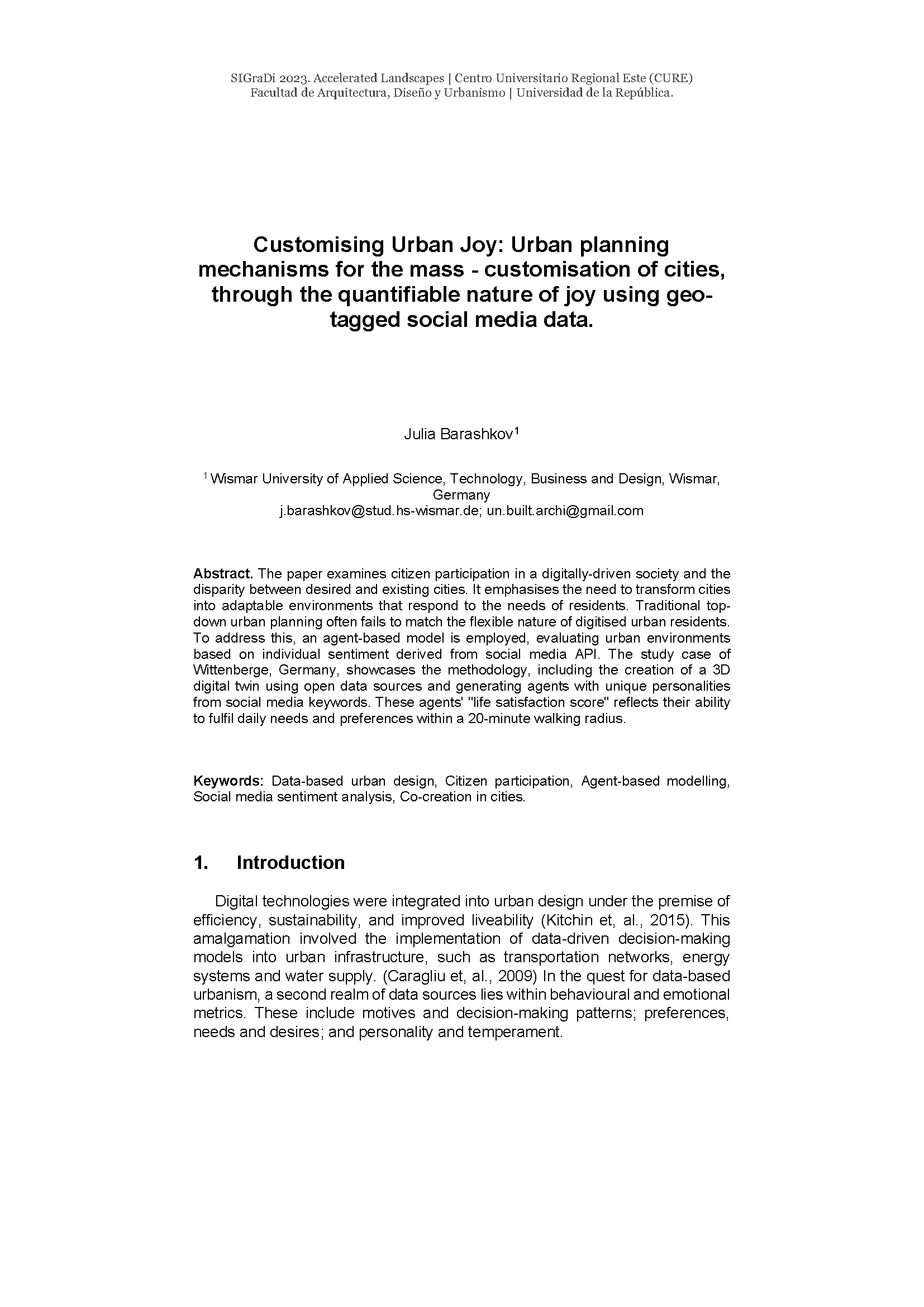 Suggested citation: Barashkov, Julia; "Customising Urban Joy: Urban Planning Mechanisms for the Mass - Customisation of Cities, through the Quantifiable Nature of Joy Using Geo-tagged Social Media Data", p. 34-45 . In: . São Paulo: Blucher, 2024.