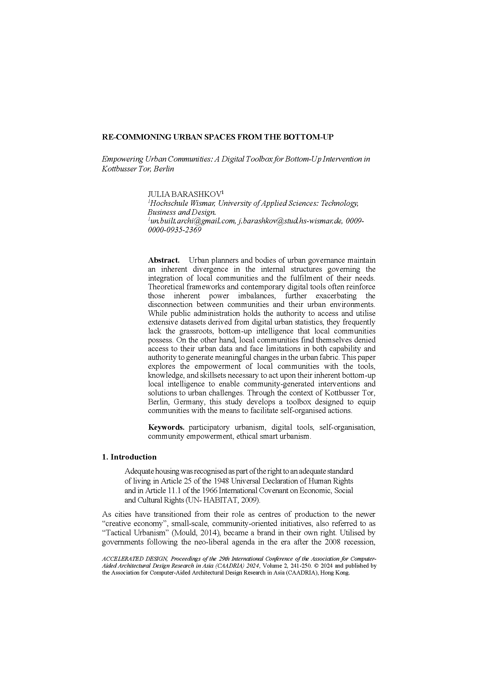 Suggested citation: Barashkov, J. (2024). Re-commoning urban spaces from the bottom-up: Empowering urban communities: A digital toolbox for bottom-up intervention in Kottbusser Tor, Berlin. In Nicole Gardner, Christiane M. Herr, Likai Wang, Hirano Toshiki, Sumbul Ahmad Khan (eds.), ACCELERATED DESIGN - Proceedings of the 29th CAADRIA Conference, Singapore, 20-26 April 2024, Volume 2, pp. 241–250 https://doi.org/10.52842/conf.caadria.2024.2.241